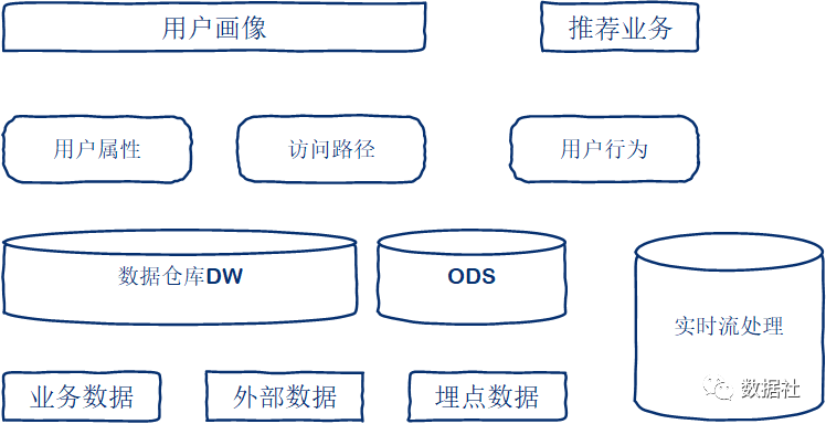 这张图也就是我们大部分用户行为分析的数据架构情况,埋点离线数据我们会采集到数据仓库,进行ETL加工处理,形成用户属性、访问路径、用户行为的一些模型。