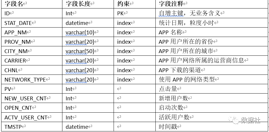 APP指标分析表,最细时间粒度到小时,用户可以通过时间、APP名称、省、市、运营商、网络类型、渠道等维度对点击量、新增用户数、启动次数、活跃用户数等指标进行多维度OLAP分析。