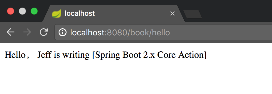 执行 ConfigApplication 类启动,在控制台看到成功运行的输出后,打开浏览器访问 /book/hello 地址,可以看到如图 2-2 所示的返回结果: