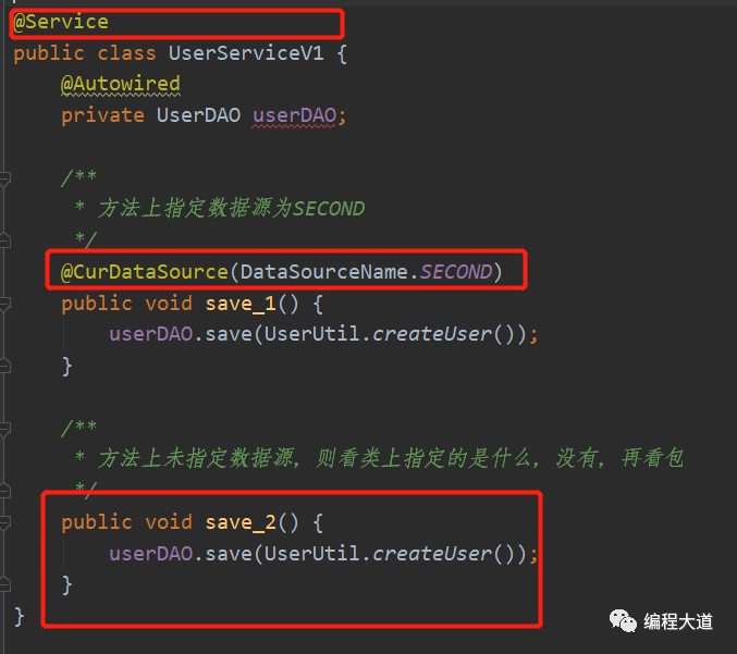 我们在save_1上添加注解指明使用SECOND,在save_2则没有,UserService1类上也没用注解,同样的,在配置类里也没配置UserService1的包名,那么save_2将会使用默认的数据源那就是FIRST