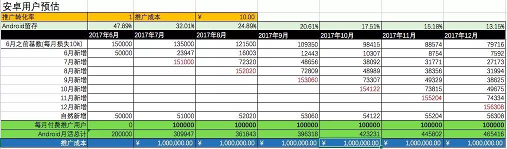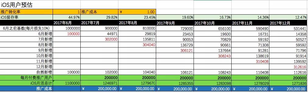 可以看出,iOS渠道和安卓渠道分开计算了,并且添加了历史存量用户流失(10%)、每月自然新增逐月递增2%几个参数,重要的是,添加了付费推广的转化率和成本。