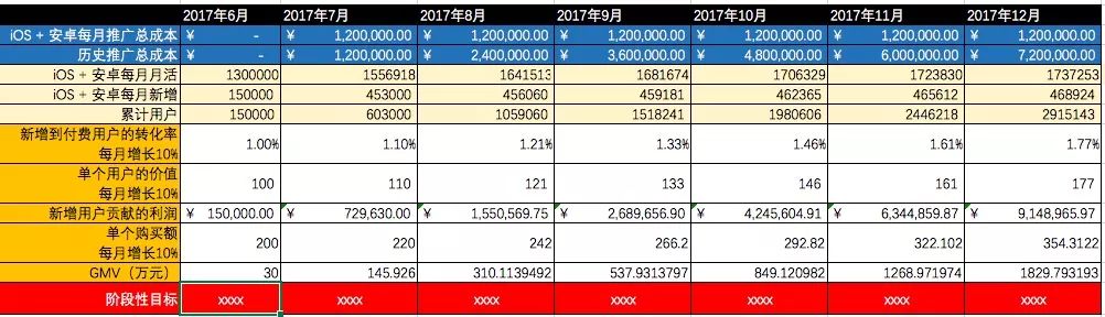 有了两个渠道的用户、成本后,就可以算更多数据了!先把总成本算出来(蓝底部分),再算用户数据(绿底部分),再然后,可以添加自己的转化数据(黄底部分)进行测算了!GMV都能算出来!