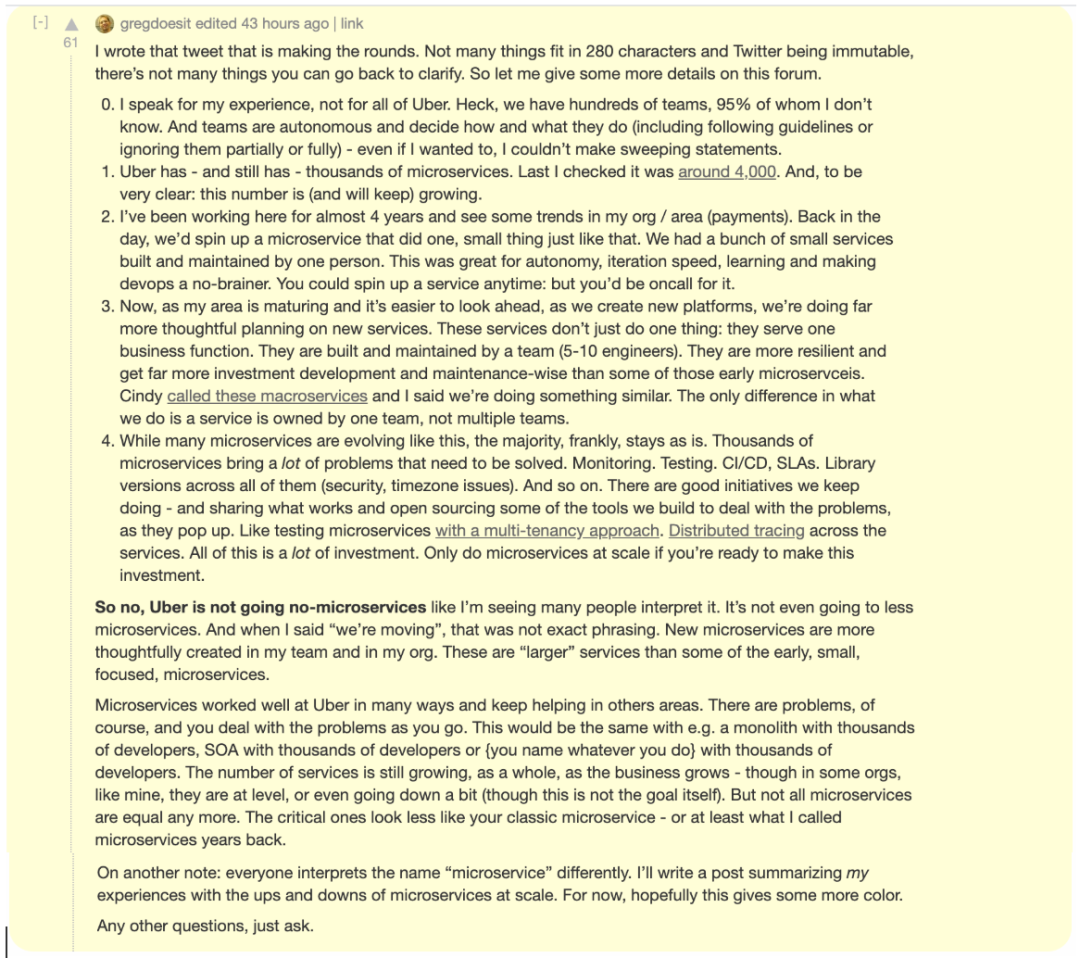 因此,当优步(Uber)这种公司的哪怕一个团队宣布从微服务改用宏服务,这颇能说明问题。想想你对优步公司有什么看法,不过从软件角度来看,优步一向是良好的企业公民。