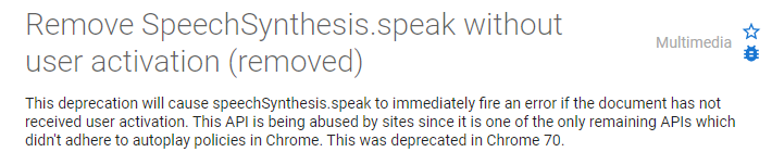 只要调用了这个函数并传入参数,你就能在浏览器中听到动听的、梦寐以求的声音了!(还是个女声,嘿嘿嘿) 目前, Chrome70已经废弃这个API了。。。(因为它可以不经过用户主动触发而直接播放)