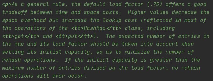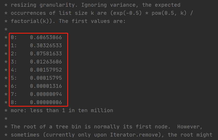 其中中间的数字表示当前这个位置预计发生指定次数哈希冲突的概率是多少。可以看到当冲突概率为8的时候,概率已经降低到了0.000006%,几乎是不可能发生的概率。从这里也可以看出,HashMap作者选择这个数作为阈值是不希望生成红黑树的(红黑树的维护成本高昂)。而同样负载因子默认选择为0.75也是基于统计分析出来的,以下是源码中对负载因子的解释: