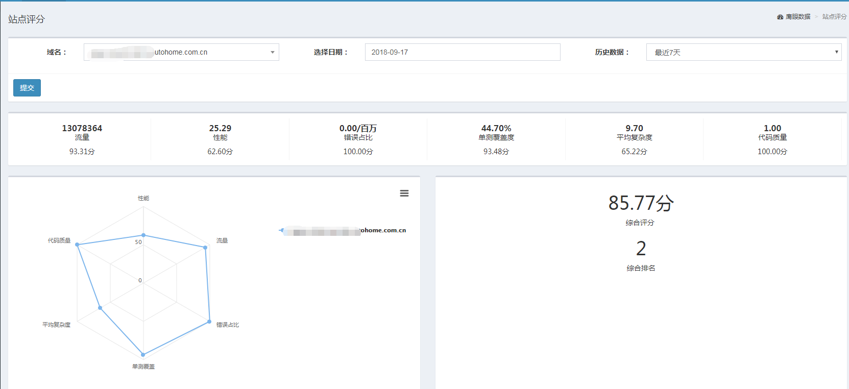 结合静态代码指标(单测覆盖率,代码复杂度,代码质量分)和动态运行指标(流量,性能,可用性)综合评价所有站点, 做一个排名,利于内部互相比较,了解自己站点各方面和别人比处于一个什么样的位置。