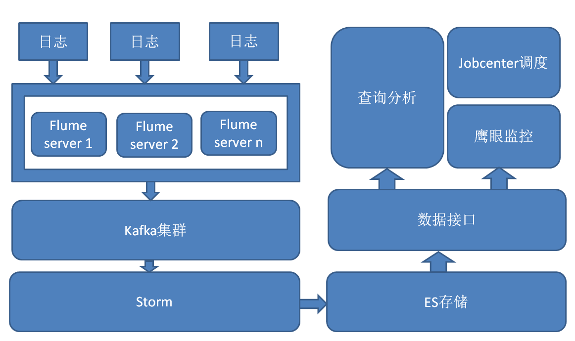 日志的消费和写入使用高性能实时计算框架-Storm来做,事实上spark和storm都能很好的完成这部分工作; 我们选择storm的原因很简单。公司刚好提供了Storm集群的资源和专门的运维团队,我们在使用storm也有一定的积累。