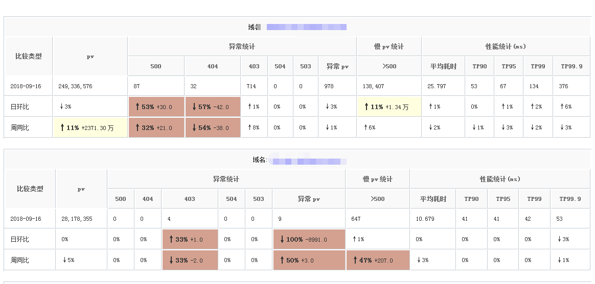 包括每个域名每天的pv, 500, 404, 503, 504, 平均耗时, TP90, TP95, TP99, TP99.9数据。日报邮件如下图: