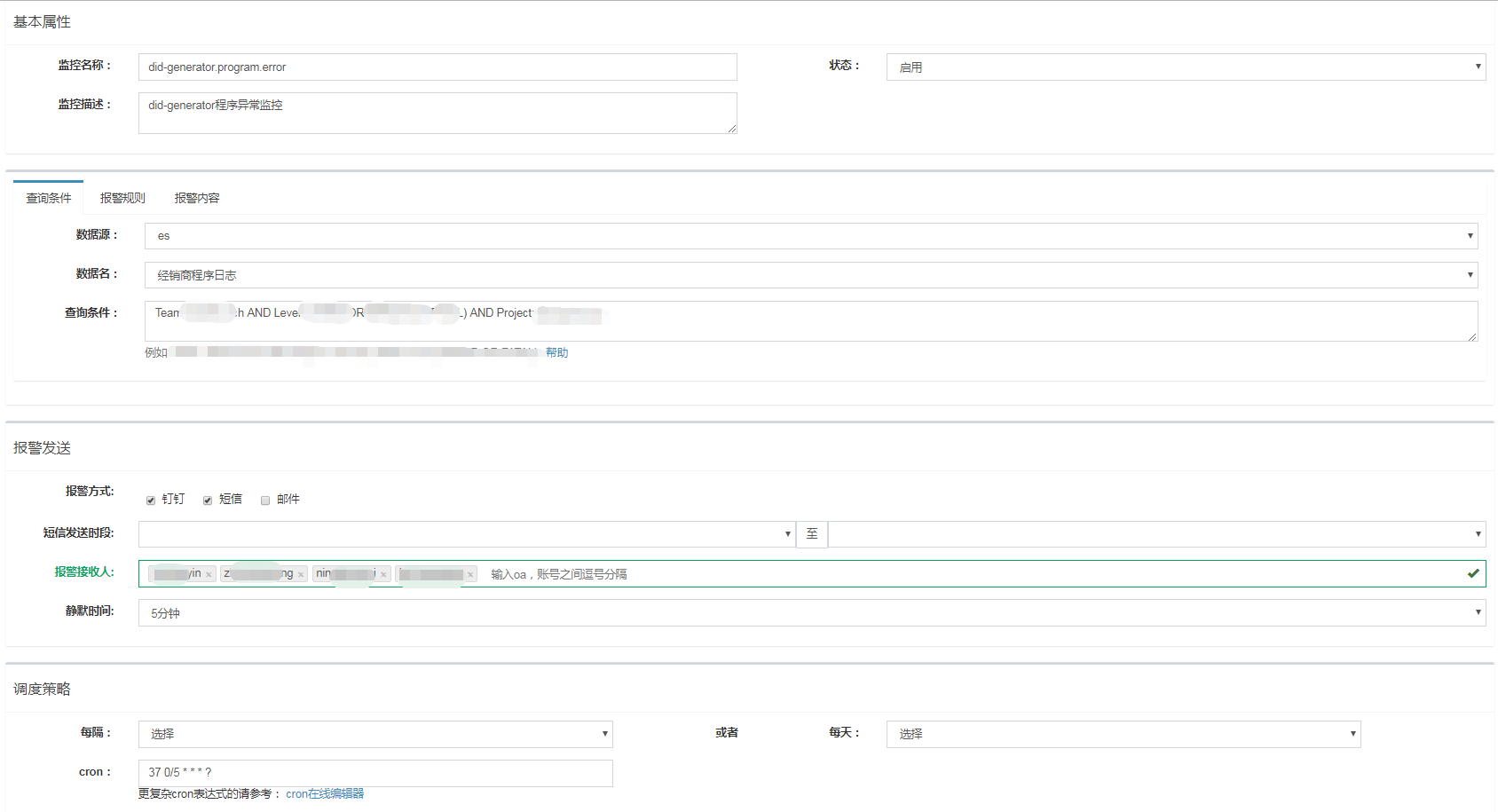 主要功能有程序日志监控,访问日志监控,慢日志监控,http调用监控,metric监控。目前运行监控数量近800个,基本线上有问题,开发同事分钟级别就能收到报警。 无论是从使用者的反馈和运行情况来看,效果还是很理想的。下面是一张我们监控配置的页面截图:
