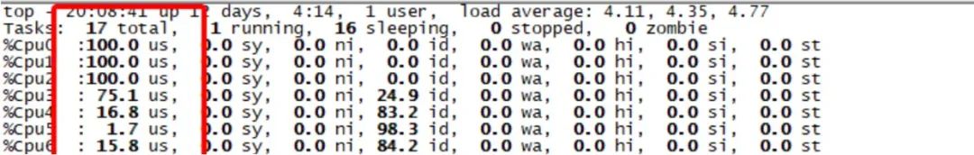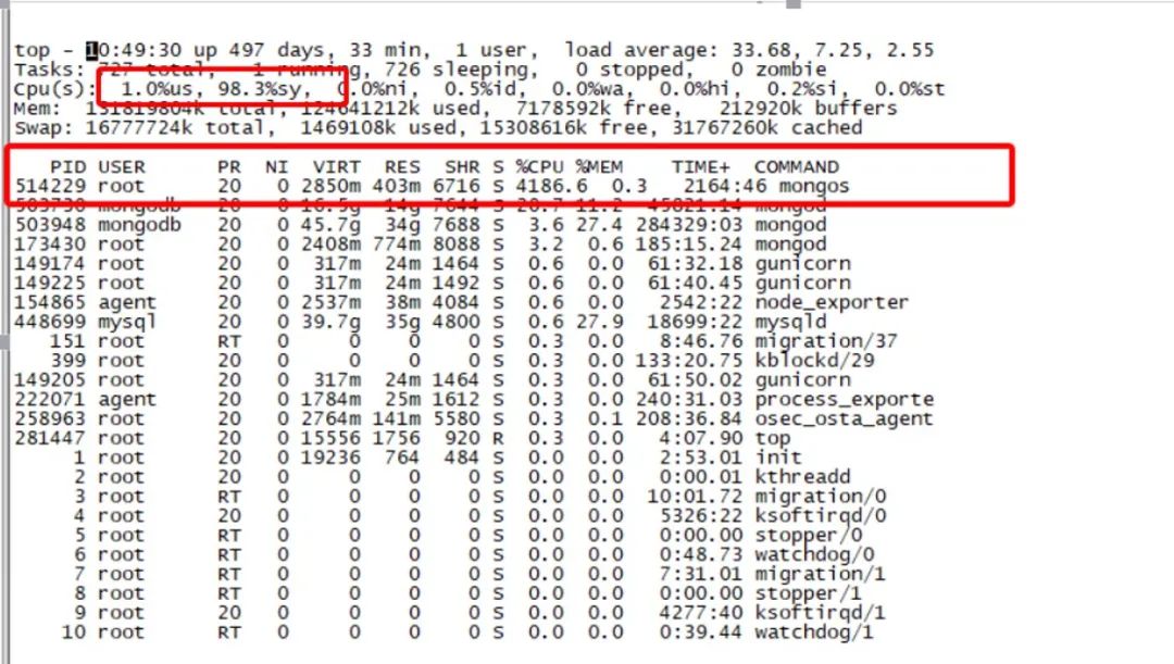 从上图可以看出,几乎和前面的突发流量引起的系统负载过高现象一致,业务CPU sy%负载100%,load很高。登陆机器获取top信息,现象和监控一致。