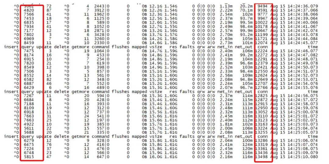 此外,该机器代理上客户端链接低峰期都很高,甚至超过正常的QPS值,QPS大约7000-8000,但是conn链接缺高达13000,mongostat获取到监控信息如下: