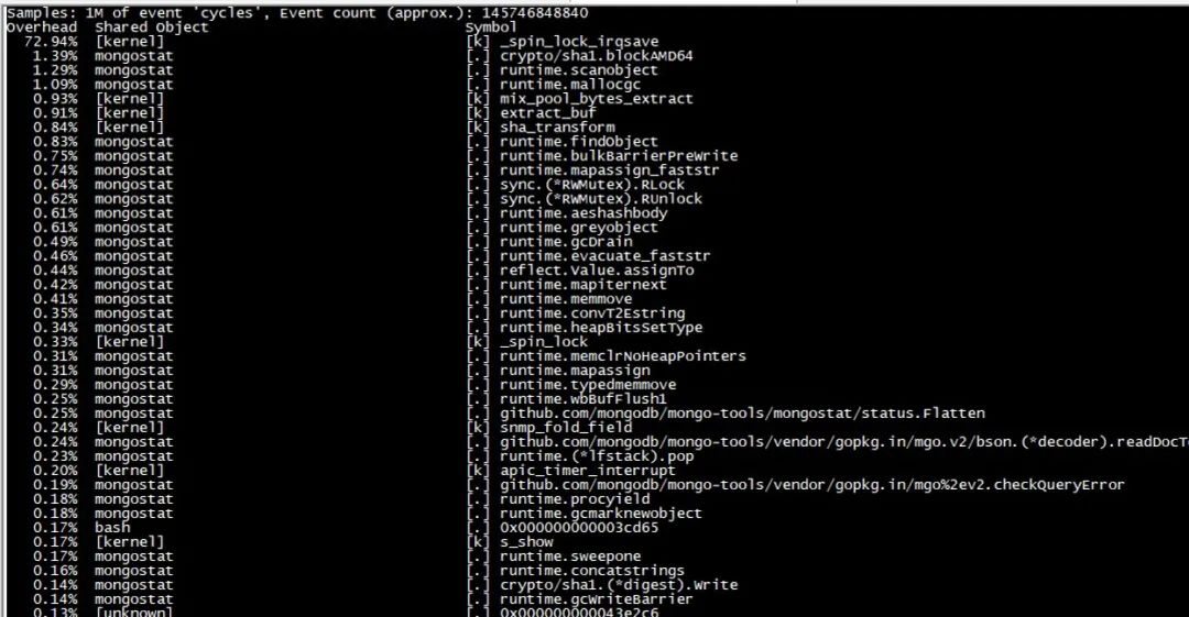 上面的堆栈信息说明,MongoDB在读取 /dev/urandom ,并且由于多个线程同时读取该文件,导致消耗在一把spinlock上。