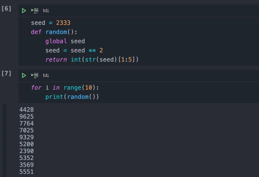 这个算法的作者是大名鼎鼎的计算机之父冯诺依曼,自从他确定了计算机体系结构之后一直沿用至今。他当时推崇这一算法的原因很简单,计算方便,速度快,也容易排查错误。它认为如果真的设计一个复杂的算法来生成看起来比较好的随机数,可能隐藏的bug比解决的问题还要多。