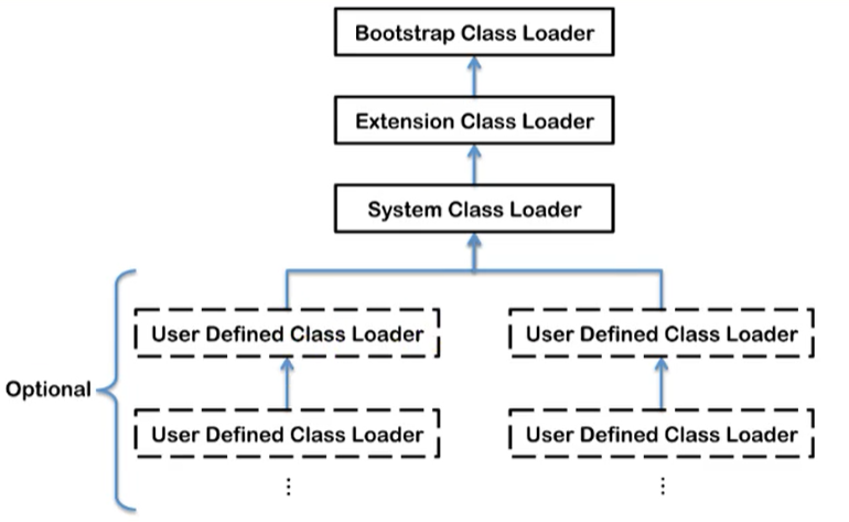 - 如果父类加载器还存在其父类加载器,则进一步向上委托,依次递归,请求最终将到达顶层的启动类加载器;