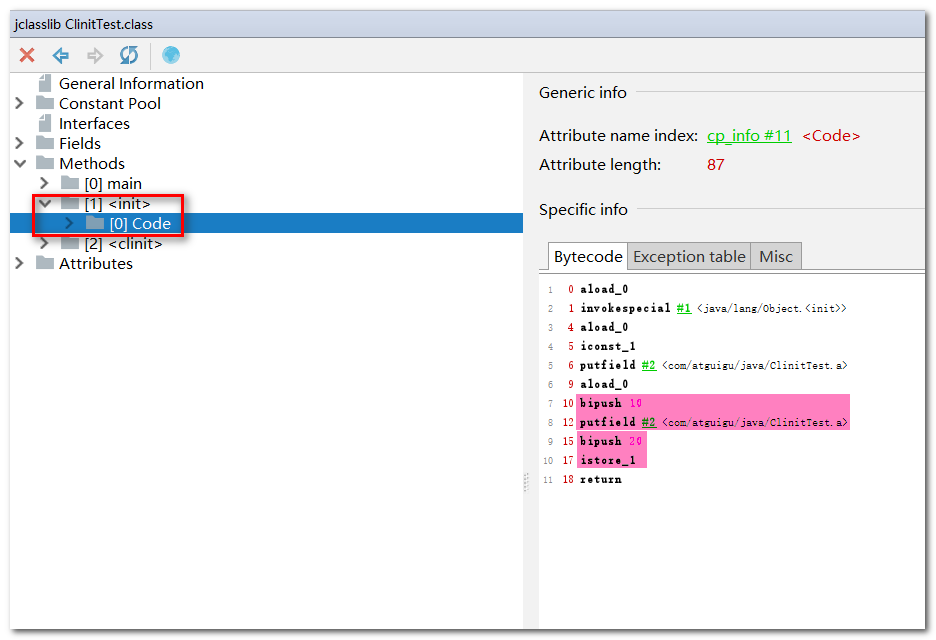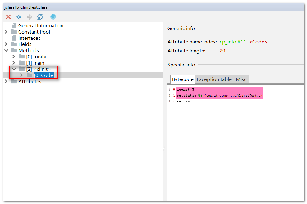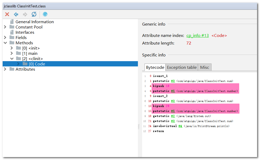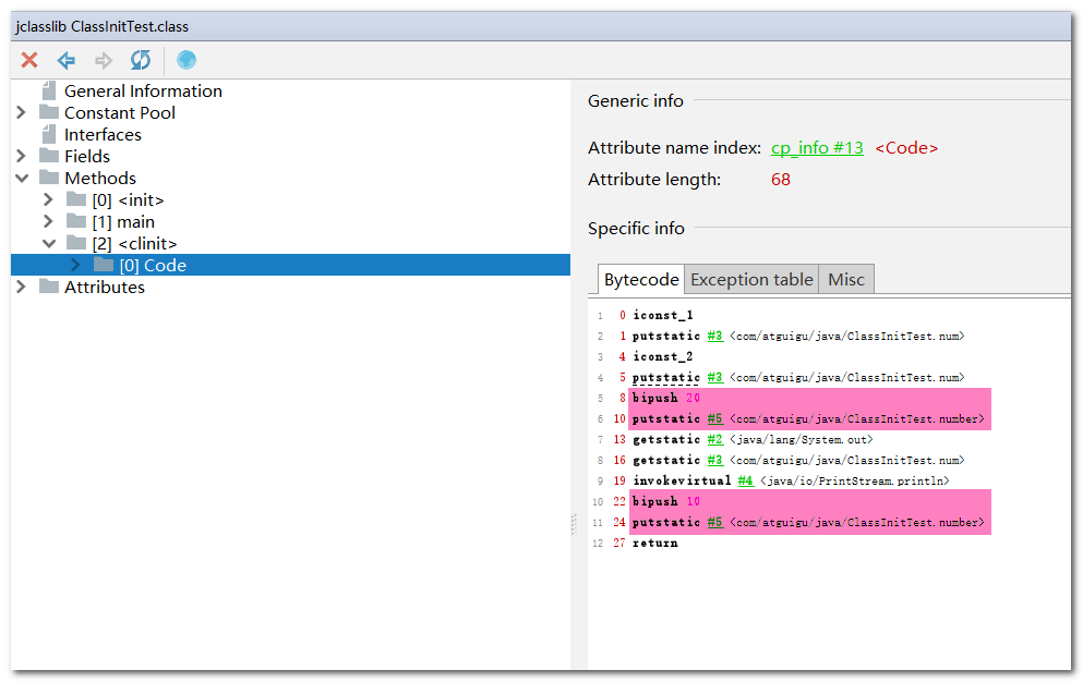 <clinit>()</clinit>的过程 - 此方法不需定义,是javac编译器自动收集类中的所有类变量的赋值动作和静态代码块中的语句合并而来。也就是说, 当我们代码中包含static变量的时候,就会有clinit方法