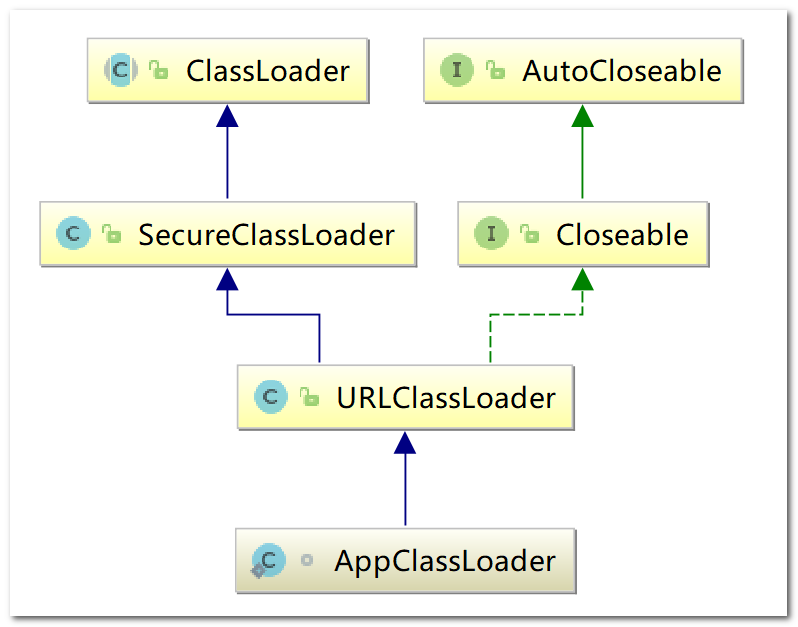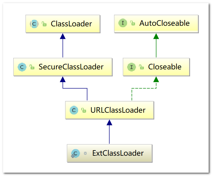 - ClassLoader类,它是一个抽象类,其后所有的类加载器都继承自ClassLoader(不包括启动类加载器)