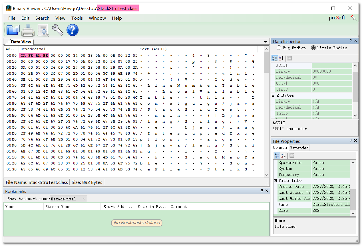 - 使用 BinaryViewer 查看字节码文件,其开头均为 CAFE BABE ,如果出现不合法的字节码文件,那么将会验证不通过