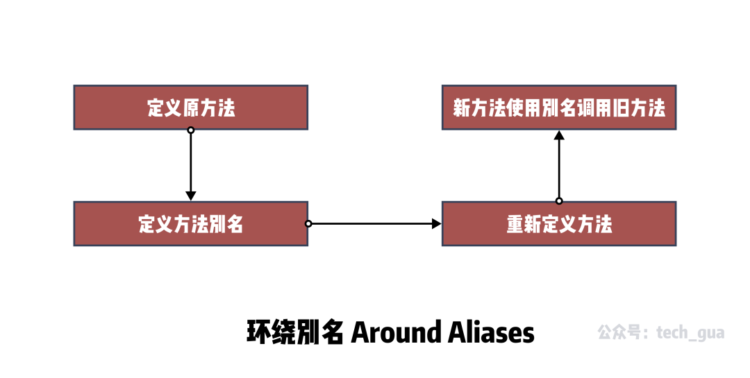 其实环绕别名只是一种特殊的写法,这里使用了 Ruby 的 alias 关键字以及上文提到的 Open Class 的特性。