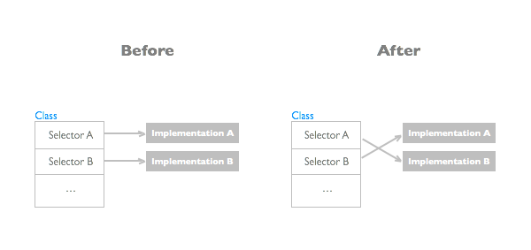 在 iOS 中,使用 Selector 和 Implementation(即 IMP)的指向交换,从而实现了方法的替换。这种替换是发生在运行时的。