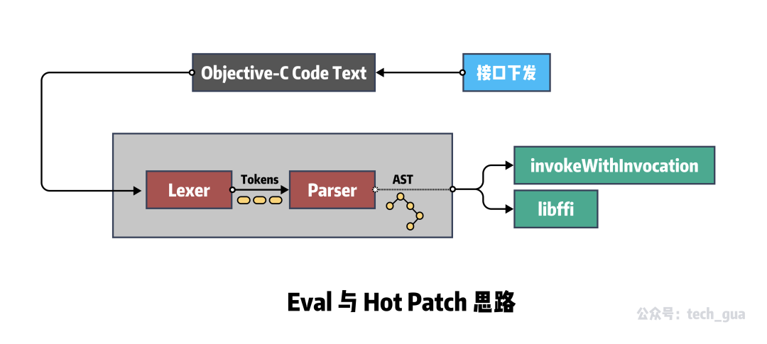 我们都知道 Objective-C 的 Runtime 利用消息转发可以动态执行任何 Objective-C 方法,这也就给了我们一个启示。假如我们自制一个轻量级解释器,动态解释 Objective-C 代码,利用 Runtime 消息转发来动态执行 Objective-C 方法,就可以实现一个“准 eval 方法”。