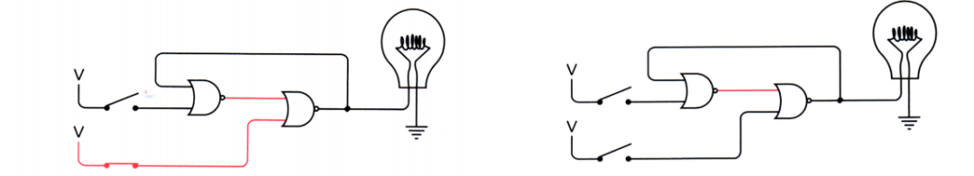 此时灯泡是不亮的。当上面的开关闭合后,左边的或非门输出 0 ,右边的或非门输出是 1,因此灯泡亮了。神奇的地方来了,此时你断开上面的开关,灯泡依然是亮的,因为左边的或非门输出还是 0,而或非门只要有一个输入是 1,输出就是 0 。