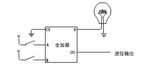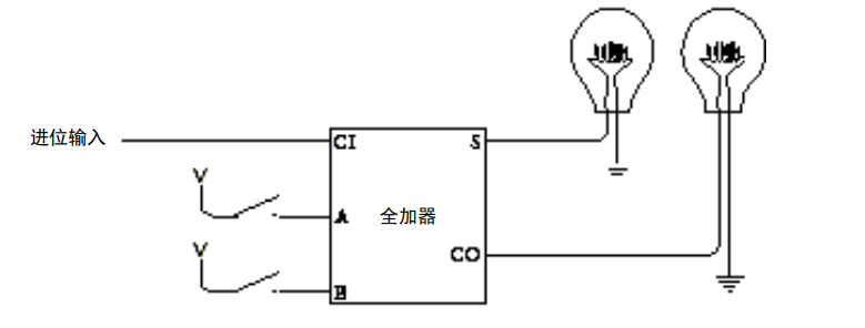 全加器有了,咱们得组合起来,并且需要有输入和输出,我们通过开关来输入数字,由灯泡的亮暗显示结果。