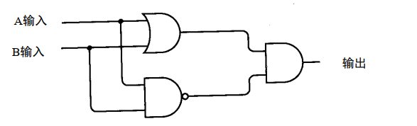 大家可以在脑子里面想象下,如果拿 OR 操作来套用的话右下角结果不对,如果是 NAND 操作的话左上角结果不对,所以得两个结合一下,电路图如下。