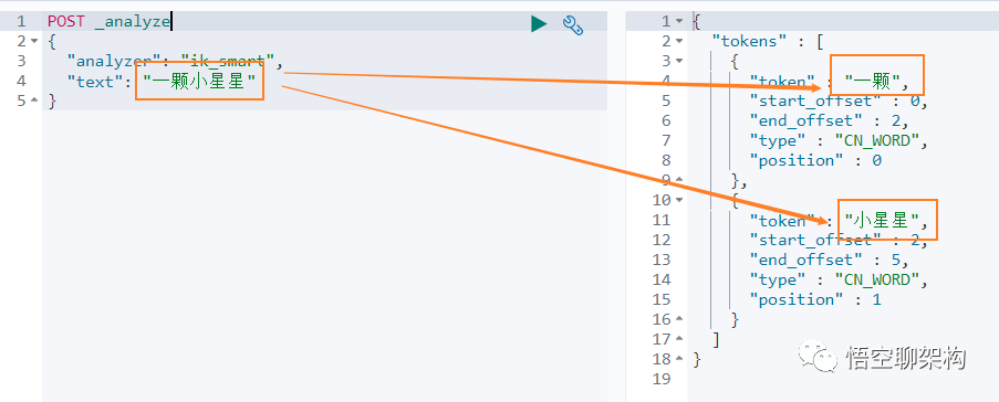 我们先看下 智能分词 模式的效果。比如对于 一颗小星星 进行中文分词,得到的两个词语:一颗、小星星