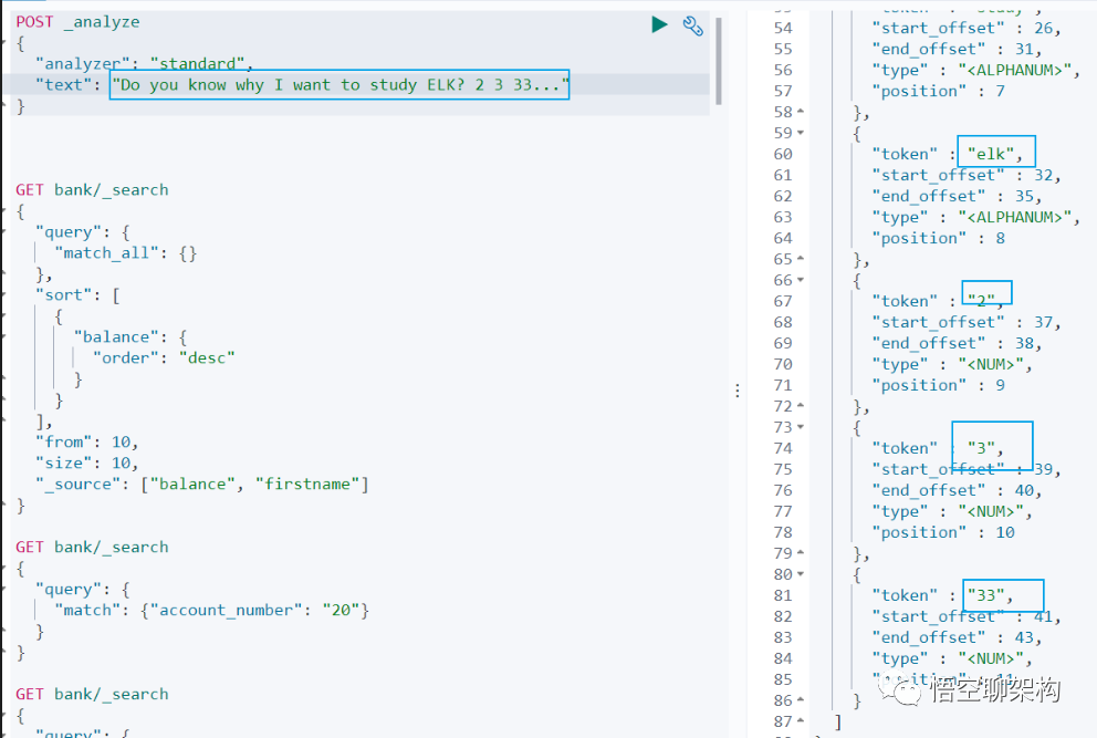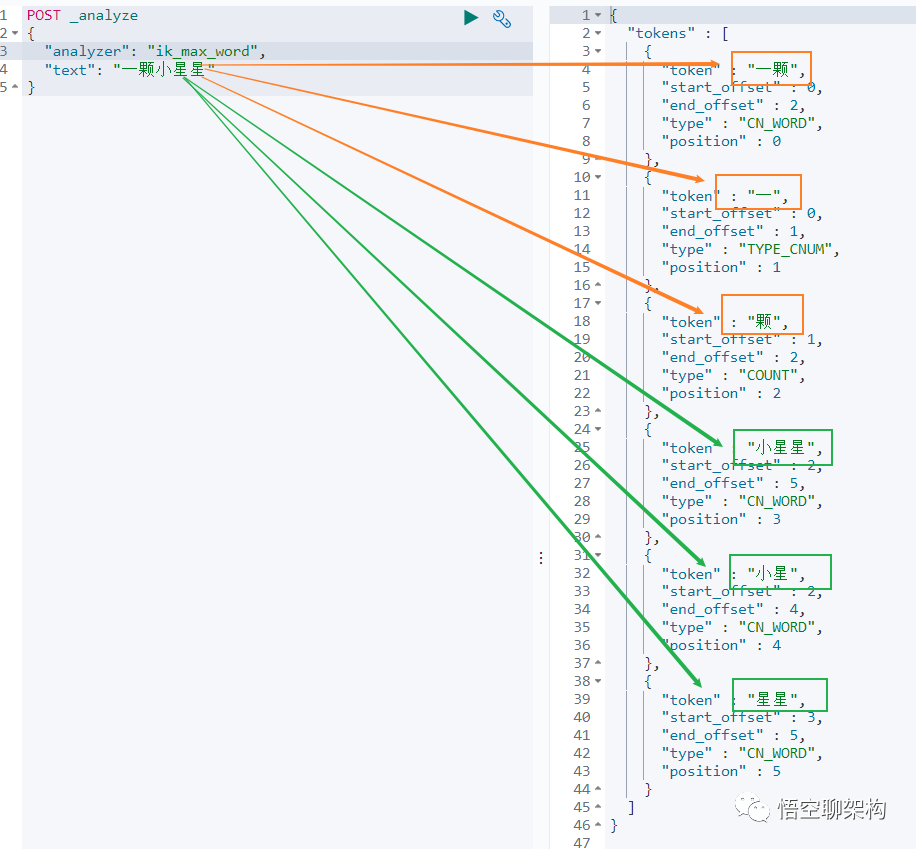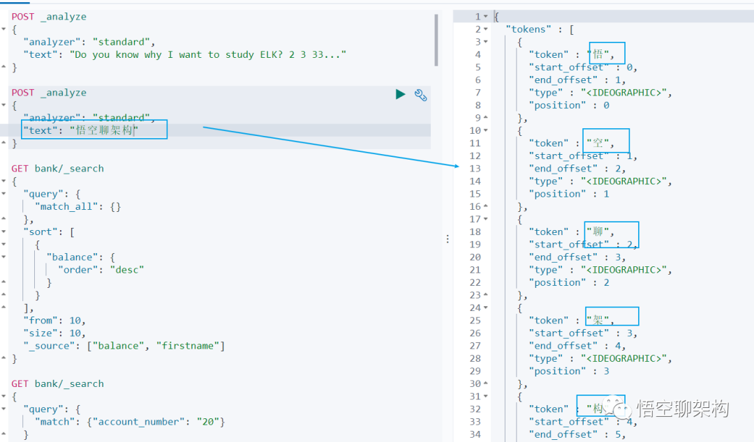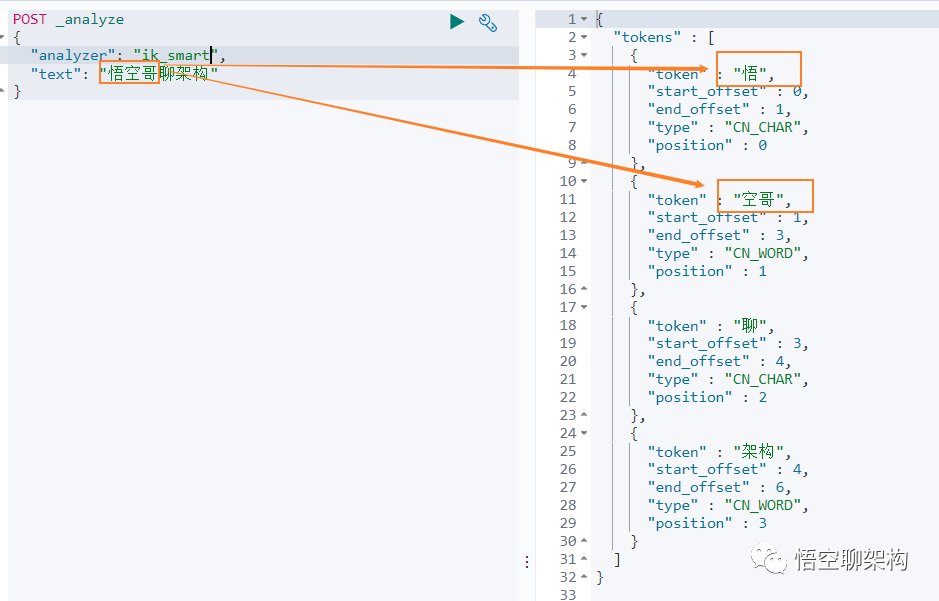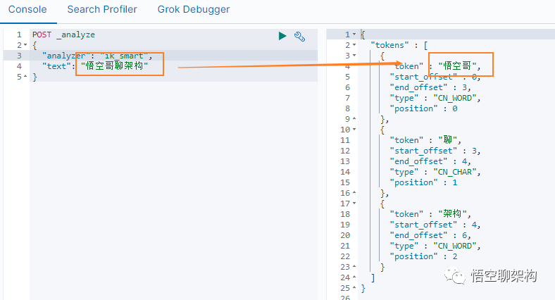 我们再来看下另外一个中文分词。比如搜索悟空哥聊架构,期望结果:悟空哥、聊、架构三个词语。