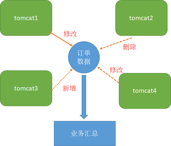 3)这四个进程需要操作同一份订单数据,但很可惜的是,你们的业务系统并没有锁处理机制,导致了同一时刻,同一份订单数据在同一时间内被反复