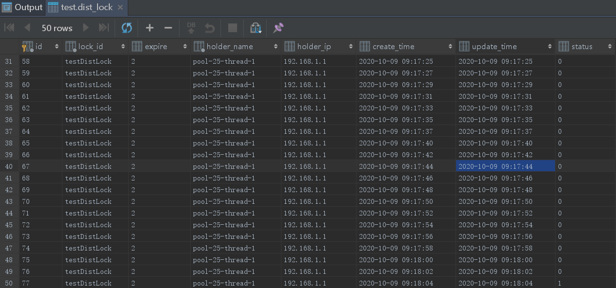 2) 表中的lock_id表示临界资源值,status为1表示该资源被线程占有,也就是加了分布式锁,