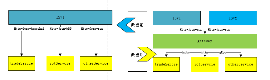 由于分属于不同的团队,所以对外提供的接口形式各异,初期还好,接口不多,ISV 也能接受,但是后期接口多了 ISV 就开始抱怨接入成本太高。