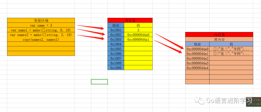 package mainimport "fmt"func main() {var names1 = make([]string, 0, 10)names1 = append(names1, "张三")names1 = append(names1, "李四")//定义一个names2切片用于接收,第二个参数要留空间,names1里面又几个元素,names2第二个参数也要是几var names2 = make([]string, 2, 10)copy(names2, names1)//将names1的值,赋值到names2fmt.Println(names1, names2) //[张三 李四] [张三 李四]names1[0] = "张三666"//修改names下标为0的值为 张三666fmt.Println(names1, names2) //[张三666 李四] [张三 李四]fmt.Printf("names1地址:%p names2地址:%p\n",names1,names2)//names1地址:0xc00009a0a0 names2地址:0xc00009a140}
