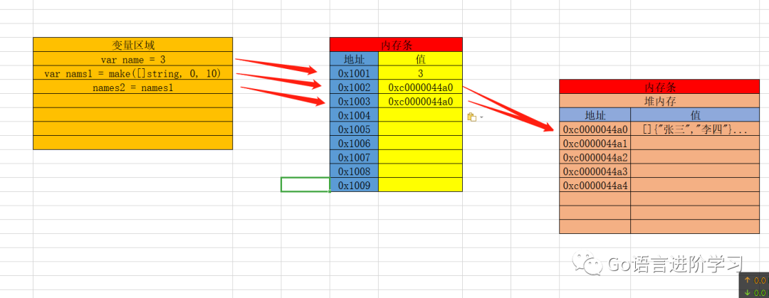 package mainimport "fmt"func main() {var names1 = make([]string, 0, 10)names1 = append(names1, "张三")names1 = append(names1, "李四")var names2 = names1 //将names1赋值到names2fmt.Println(names1, names2) //[张三 李四] [张三 李四]names1[0] = "张三666"//修改names下标为0的值为 张三666fmt.Println(names1, names2) //[张三666 李四] [张三666 李四]//为什么修改names1的值,会影响names2的值????}
