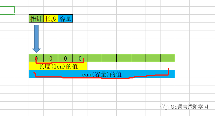 在不使用make声明数组时,len和cap都是0,并且地址也是一个值。