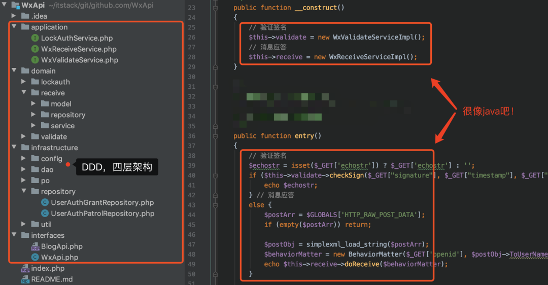 这呢就是我在10.1放假的最后一天,把Java语言开发的公众号后台,切换成PHP的经历。但代码结构没变,依旧是我喜欢的DDD领域驱动设计。 重要的是省钱了!,这里还有一个Java版本的公众号后台开发。 Java版DDD四层架构,开发公众号服务端 -