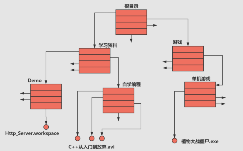 整个文件系统的模型是一个层次结构,就像是一颗多叉树。从最顶层的文件夹依次以树干、树枝的形式进行查找,就可以搜索到最底部的文件目录。