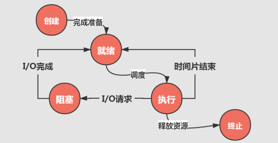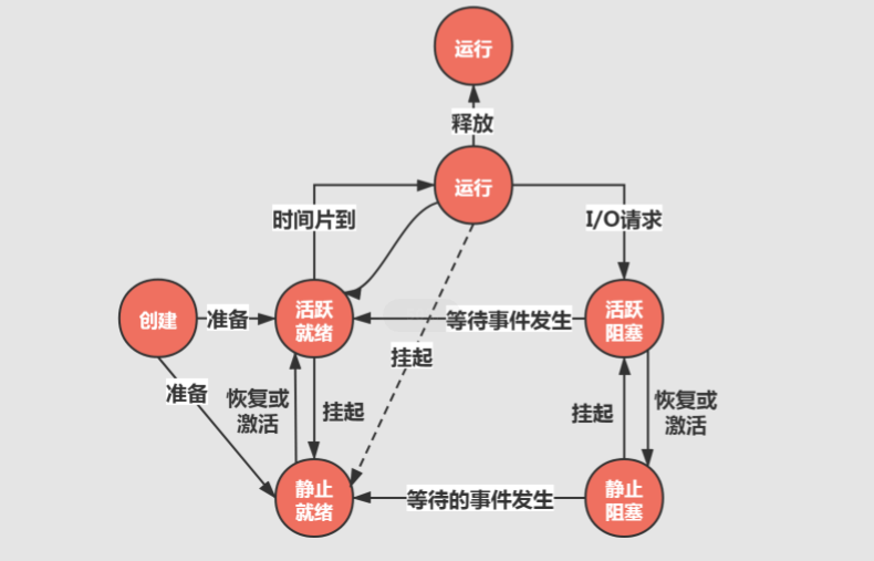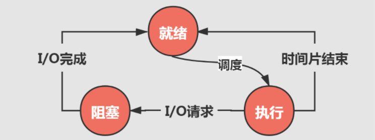 执行状态 是指进程正常运行的状态。而当处于执行状态的进程由于需要等待某个事件发送(通常为等待I/O)时,就会放弃CPU,从而进入暂时的阻塞状态。CPU这时一旦空出,通过不同的调度算法,CPU又会被分配给另一个就绪进程。