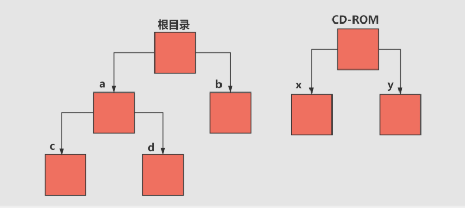 在下图中,CD-ROM上的文件系统已安装在目录b中,因此可以访问文件/b/x和/b/y。如果目录b包含其它文件,则在安装CD-ROM时将无法访问它们,因为/b将引用CD-ROM的根目录。不过一般而言,文件系统几乎总是挂在空目录上。如果系统包含多个硬盘,它们也都可以挂载到单个树中。