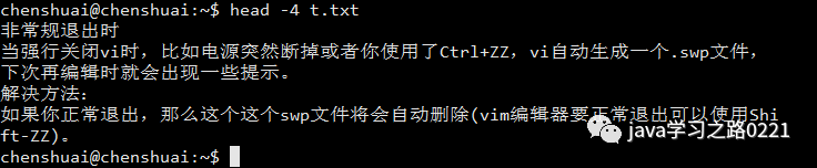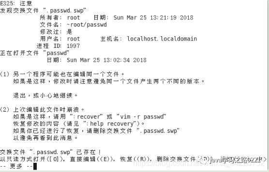 :wq)强制关闭终端时,就会产生异常退出,如下图。这时系统会建立file.swp这个缓存文件,这个文件中保存着没有:wq动作保存的信息。