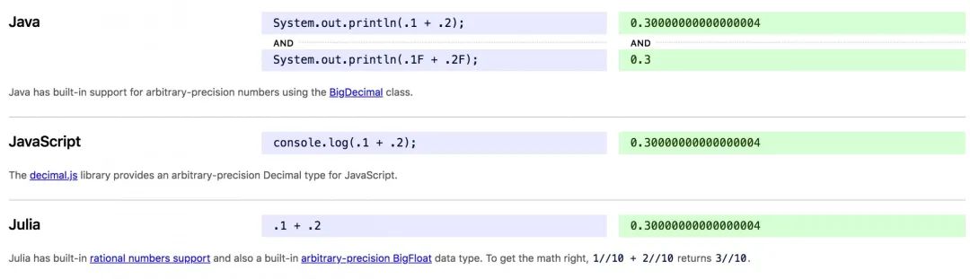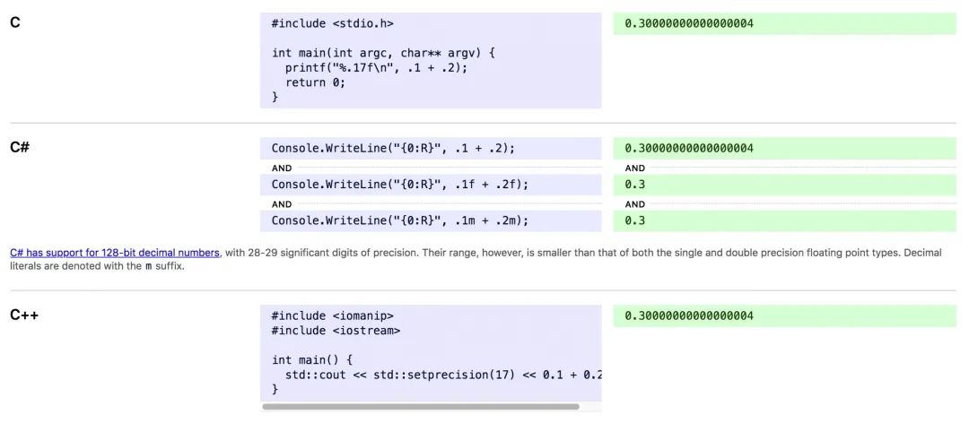 在这个网站中,列举了各种编程语言中计算0.2+0.1的结果,摘选几个如下: