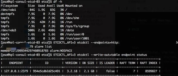似乎磁盘、内存空间都足够的。从官网的信息了解到应该是etcd配额的问题,Etcd v3 的默认的 backend quota 2GB,也就是说etcd默认最大的配额是2GB,如果超过了则无法再写入数据,要么把旧数据删除,要么把数据压缩了。