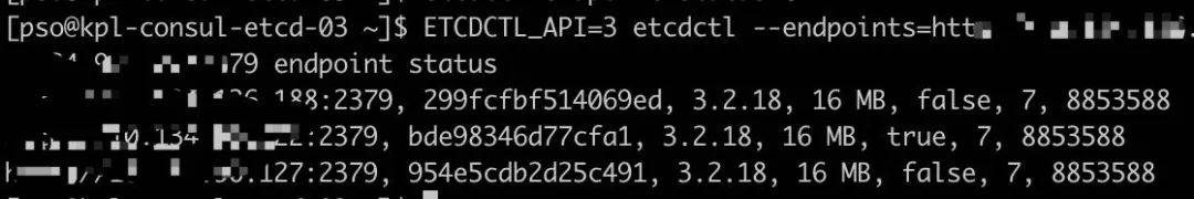 http://10.xx.xx.3:2379, 954e5cdb2d25c491, 3.2.18, 2.1 GB, false, 7, 8701687