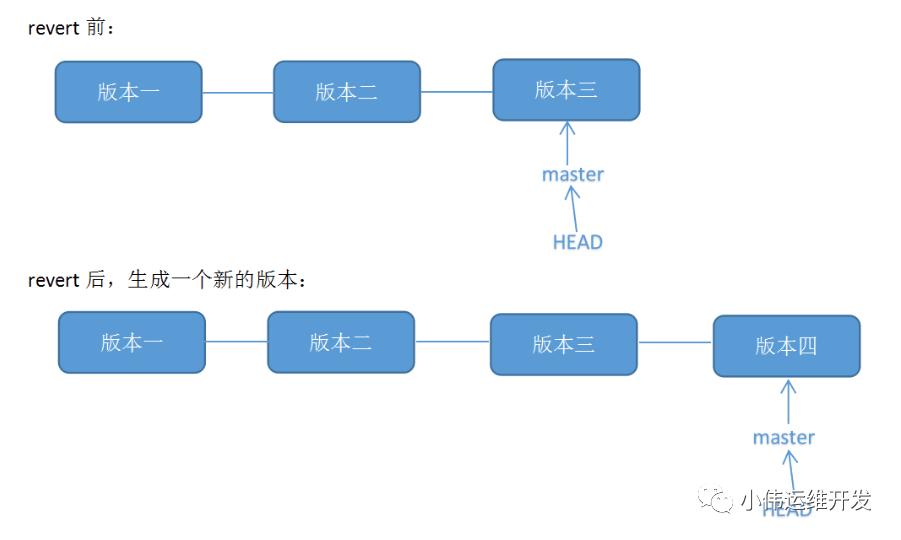 git revert的作用是把之前提交的版本作为一个新版本再次提交(提交位置为当前版本的后一个位置,如想要回滚到版本二,当前为版本三,则重新提交的为版本四,不会像reset删除回滚之后的版本,只会还原版本二所提交的内容),以达到撤销该版本的修改的目的。如下图所示: