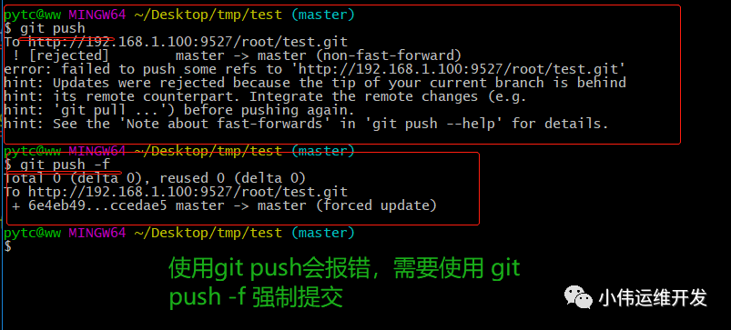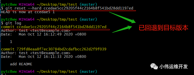 [root@db test]# git reset --hard fa8f987d9ac5f37b7e77cbf519825b712ee3b03a # 回滚到指定版本(我这里是回滚到上一个提交的commit_id)