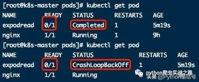执行 nginx -s stop 命令后,容器就会退出,因为 Nginx 容器是持续提供服务的,服务停止后,容器就异常了,然后 kubernetes 又会重新拉起一个容器,在这个过程当中,我们使用 kubectl get pod 命令就会发现,容器的状态先变为 Completed,然后变为 CrashLoopBackOff,最后变为 Running。
