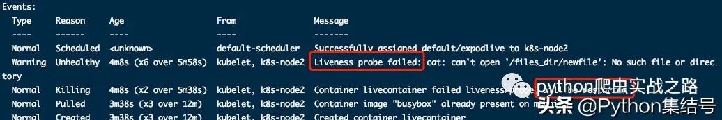 可以看到 Event 中打印了存活探针的运行情况:存活探针失败,并且准备重启。