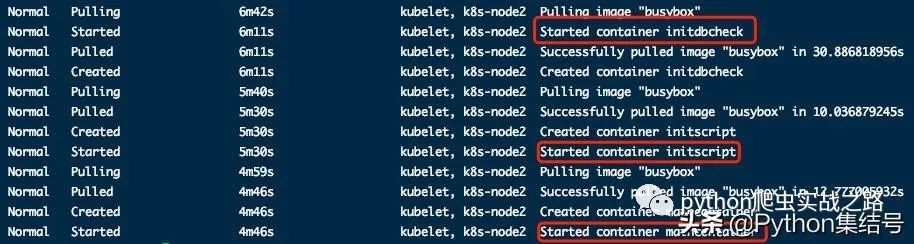 在 30s 内执行第一个初始化容器,所以 Pod 状态是 Init:0/2,在 30s-60s 之间执行第二个初始化容器,所以 Pod 状态是 Init:1/2,当所有初始化容器执行完毕后,状态会先变为 PodInitializing,然后变为 Running 状态。通过 kubectl describe 命令查看 Pod 详细信息,可以看到先执行 initdbcheck,然后执行 initscript,最后才运行 maincontainer。