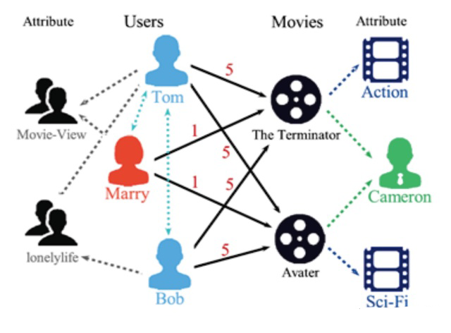 在用户和物品的二部图基础上,增加物品的属性作为顶点,建立新的边,就得到了一个异质信息网络 。比如一个电影推荐系统,除了用户和电影外,还有导演,演员,电影类型,导演拍摄电影,电影属于某种类型,演员出演电影,导演与演员合作,诸如此类就能建立很多边。其中一类推荐算法叫做meta-path ,通过专家经验人工挑选出一些图中路径,如用户->演员->电影,用户->导演->电影,这样的路径称之为meta-path,计算每一条meta-path的权重,将用户和物品间的所有meta-path联合计算评分。