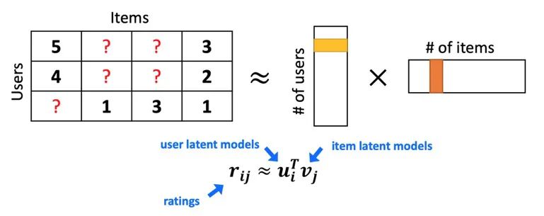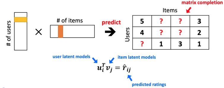 维的物品矩阵,每一列是物品的隐式向量表示,用户和物品向量的内积即为预估的评分。那如何进行分解呢?随机初始化矩阵,使用均方误差作为loss,梯度下降进行学习。这个过程中还可以加入正则项,降低泛化误差。由 FunkSVD 开始,基于 Matrix factor(MF) 的方法大放异彩。